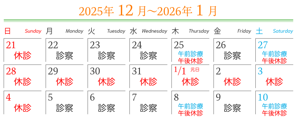 2025年12月28日(日)から2026年1月4日(日)まで年末年始の休診とさせていただきます。